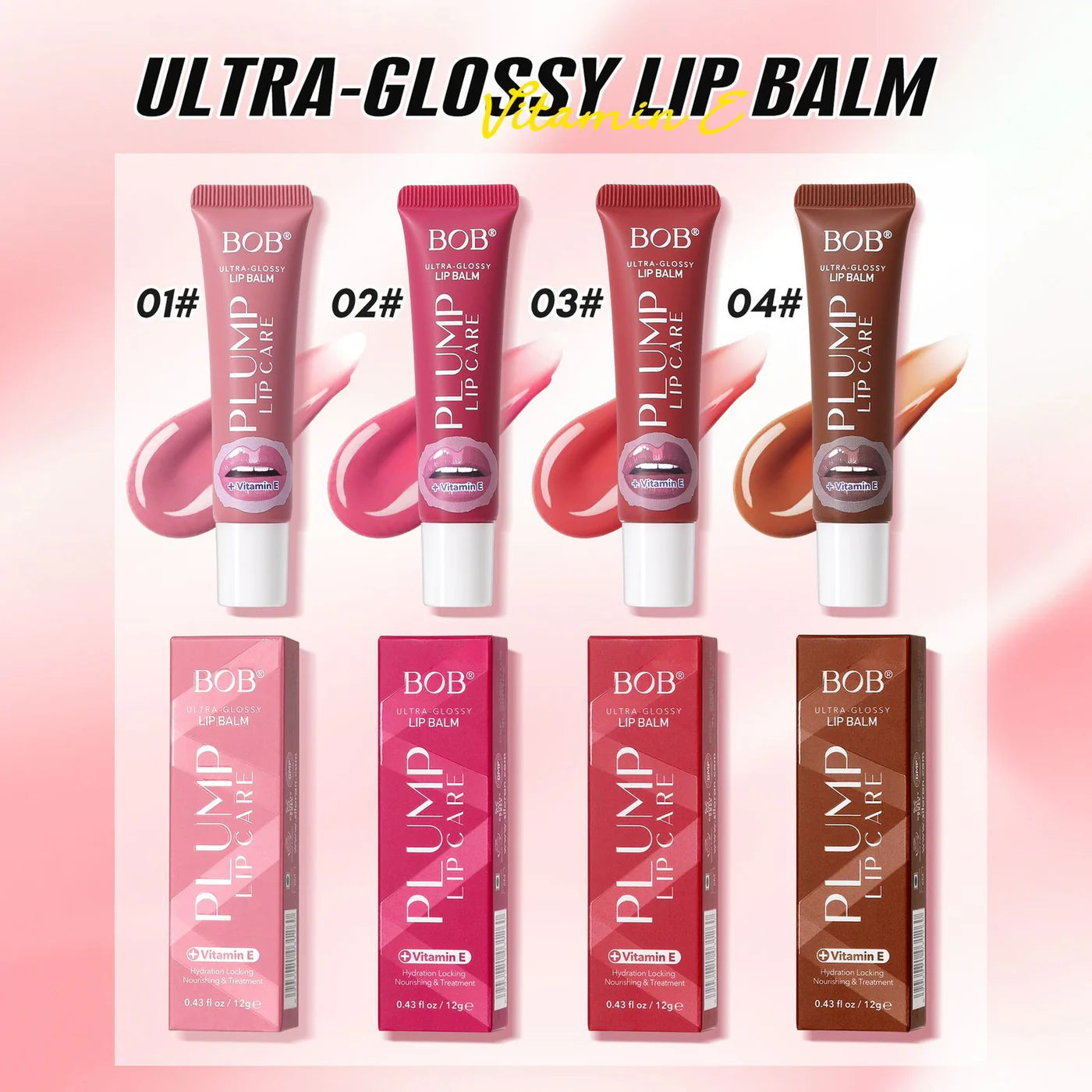 Nourish, plump, and shine with the BOB Ultra-Glossy Lip Balm collection! Available in 4 radiant shades (01# to 04#), each balm is enriched with Vitamin E to deeply hydrate and soften your lips while delivering a smooth, glossy finish. Whether you prefer a subtle nude, a pop of pink, or a bold berry tone, these lip balms are perfect for everyday wear and lip care.
